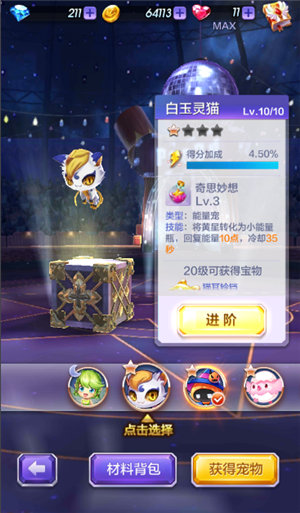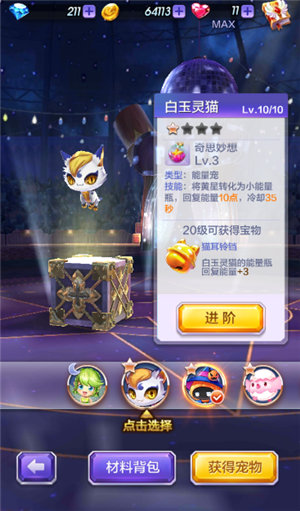 作为一阶星星宠,白玉灵猫的基础属性不算很高,但在进阶后基础属性会有显著的提升,它的等级提升到20级后还能获得宝物,配合白玉灵猫使用,可以让玩家获得大量能量。1阶的白玉灵猫等级上限只有10级,要想把它提升到20级必须先提升它的品阶,这也是需要大量材料的哦。