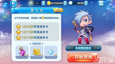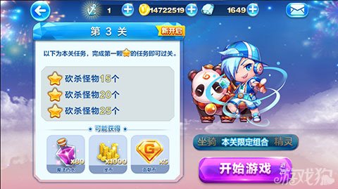 关卡一共30关,也就是说完美完成全部关卡一共会收集到90颗星星。需要注意的是,每关关卡系统都会指定特定的人物和坐骑,不可以随便更换。