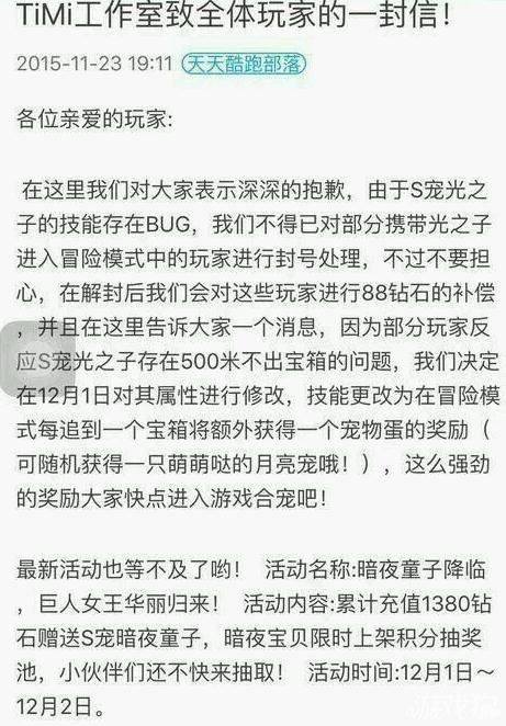 关于天天酷跑光之子属性被修改 补偿公告通知的玩家互动如下: