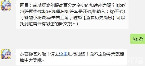 下面小编就来揭晓答案啦,其实今天问题的答案很简单。南瓜灯笼能提高25%的加速能力,所以大家只要回复kp25就可以啦。