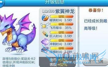 从技能描述中我们能够发现,紫翼神龙是第一只拥有四种技能的坐骑,可以说紫翼神龙=强化版暴力鸟叔+1/2糖白虎。而它的开局冲刺800米更是刷新了鸟叔和白虎的记录,成为酷跑上开局冲刺最远的坐骑。虽然技能描述上只说了它有踩怪5倍得分,但其实它在进击模式中砍怪也是有5倍得分的,这点小伙伴们不需要担心。