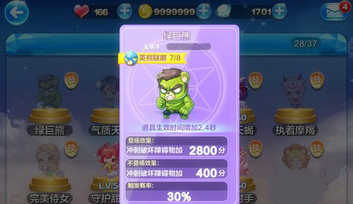 这两种精灵都是依赖破坏障碍物得分的,但是和小丑熊不同,绿巨熊在破坏障碍物时,需要在冲刺状态下才能得分;而小丑熊在冲刺状态或者其它状态下,只要能破坏障碍物都可以得分。所以说,其实这两款精灵的表现是不相上下的。