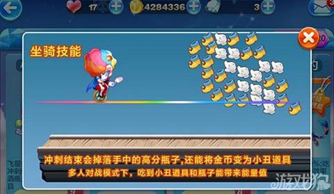 坐骑技能:冲刺结束会掉落守中的高分瓶子,还能将金币变为小丑道具