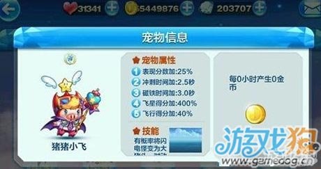 答:你好,天天酷跑上猪猪小飞好,①表现分数加25% ②冲刺时间加2.5s ③磁铁时间加3.0s ④飞星得分加成400% ⑤飞行得分加成40% 技能:有几率将闪电怪变成大猪头 >>详细