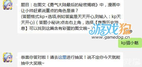 今天问题的答案是猫小魅,玩家们只要回复kp猫小魅就行啦。另外建议大家都把答案记住哦,回答正确之后就能领奖啦。