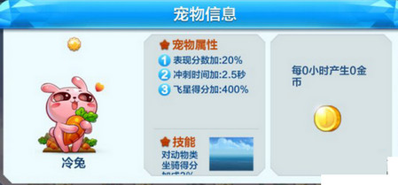 表现分数加:25%;冲刺时间加:3.0s;飞星得分加:400%;踩怪得分加:50%;超级模式奖励加:35%;技能:对动物类坐骑得分加成6%