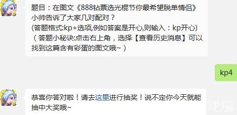 天天酷跑11月13日微信每日一题答案是4,天天酷跑11月13日微信每日一题是在图文888钻票选光棍节你最希望脱单情侣,小帅告诉了大家几对配对?这个问题的答案是多少,不熟悉的玩家可能一下子无法回答,下面小编就来告诉大家答案。