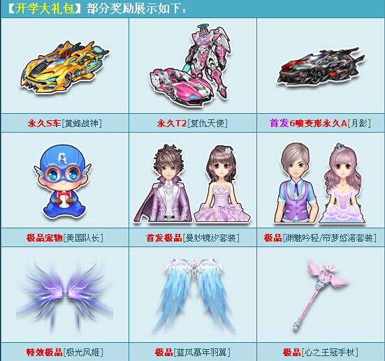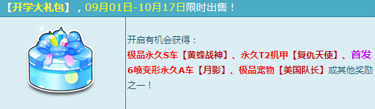 今天小编给大家带来的是关于QQ飞车开学大礼包活动介绍,小伙伴们一起来看一看吧。9月开学季,《QQ飞车》为广大童鞋送来【开学大礼包】,开启即有机会获得:极品永久S车【黄蜂战神】、永久T2机甲【复仇天使】、首发6喷变形永久A车【月影】、极品宠物【美国队长】或其他奖励之一!