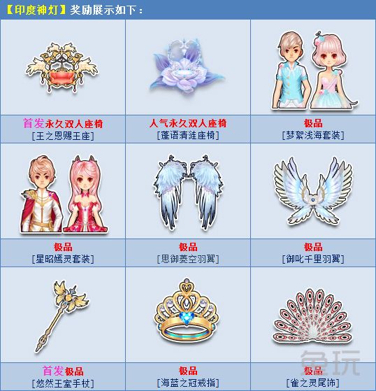 11月20日-12月31日期间,印度神灯首发双人座椅!擦亮必得角色经验卡+600,还有机会获赠首发永久双人座椅【王之恩赐王座】、永久双人座椅【蓬语清涟座椅】、极品【梦絮浅海套装】/【星昭嫣灵套装】、首发极品【悠然王室手杖】或其他奖励之一!