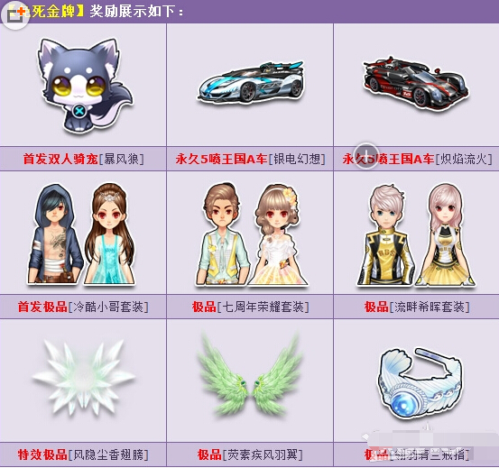 9月3日-10月3日期间,【免死金牌】限时发放中,购买免死金牌必得角色经验卡+1400,还有机会获赠首发双人骑宠【暴风狼】、永久5喷王国A车【银电幻想】及【炽焰流火】、首发【冷酷小哥套装】、【七周年荣耀套装】或其他奖励之一,千万不要错过哦!