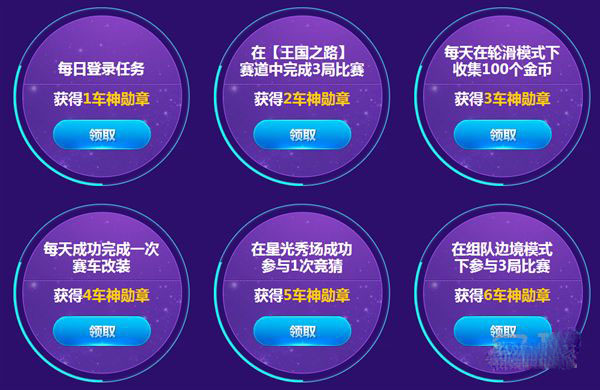 2.每天完成不同的任务可以领取对应的车神勋章;