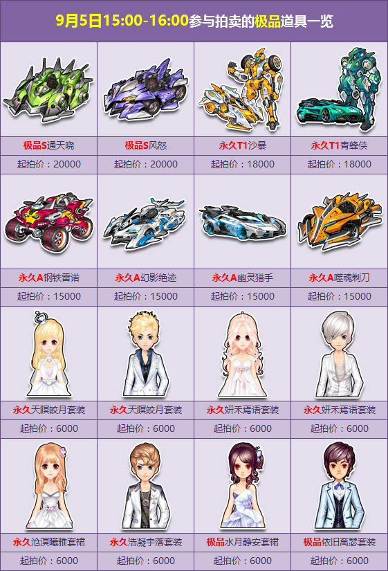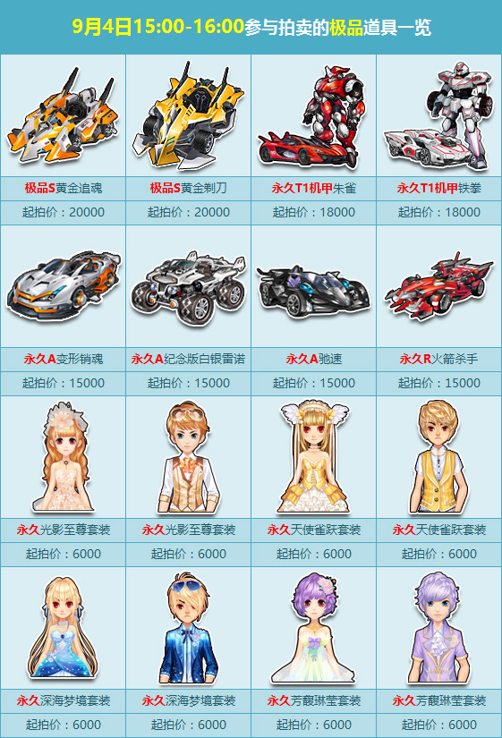 今天小编给大家带来的是关于QQ飞车九月极品拍卖会的具体内容介绍,小伙伴们一起来看一看吧。新学期限量拍卖会开启,9月3日至9月5日期间每天15:00-16:00,多款极品道具限时限量拍卖。极品S车、永久机甲、永久A车、奢华服饰、极品双人骑宠等极品应有尽有,绝对让你狂拽炫酷迎接新学期!
