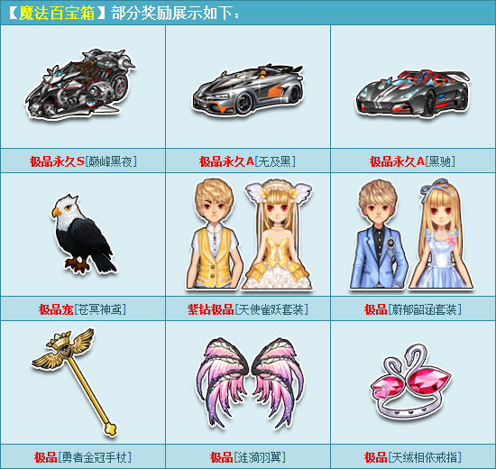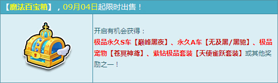 9月4日开学季,【魔法百宝箱】欢乐更新,打开百宝箱即有机会得极品永久S车【巅峰黑夜】、永久A车【无及黑/黑驰】、极品宠【苍冥神鸢】、紫钻极品【天使雀跃套装】或其他奖励之一!