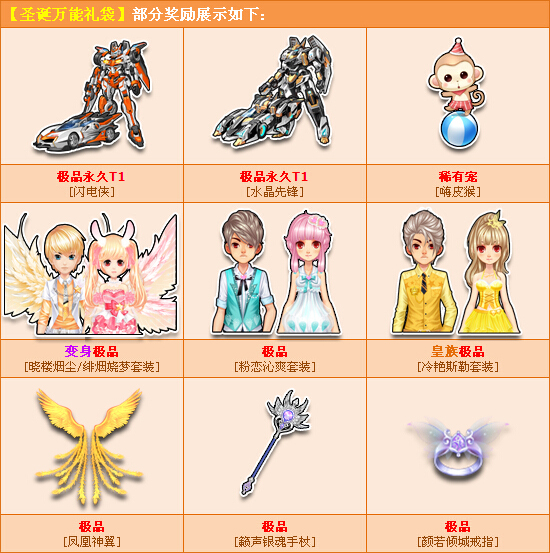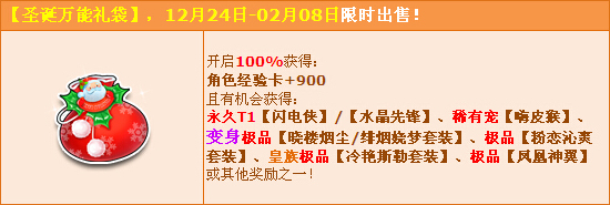 圣诞狂欢前夕,永久T1+变身套装惊喜来袭,12月24日-2月8日,仅需6.4Q币,购【圣诞万能礼袋】,100%获得角色经验卡+900,且有机会获得永久T1【闪电侠】/【水晶先锋】、稀有宠【嗨皮猴】、变身极品【晓楼烟尘/绯烟娆梦套装】、极品【粉恋沁爽套装】、皇族极品【冷艳斯勒套装】、极品【凤凰神翼】或其他奖励之一!