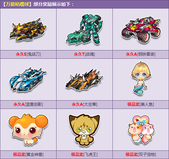 今天小编给大家带来的是关于QQ飞车万能咕噜球开出物品介绍,2Q币就享永久S车鬼战刀,小伙伴们一起来看一看吧。万能咕噜球首发上市!9月22日起,仅需2Q币,开启即有机会获得:永久S【鬼战刀】,永久T【战魂】,永久A车【钢铁雷诺】/【蓝兽剑影】/【太空隼】,极品宠物【美人鱼】/【黄金神兽】/【飞虎王】/【双子宠物】或其他奖励之一!千万不要错过哦!