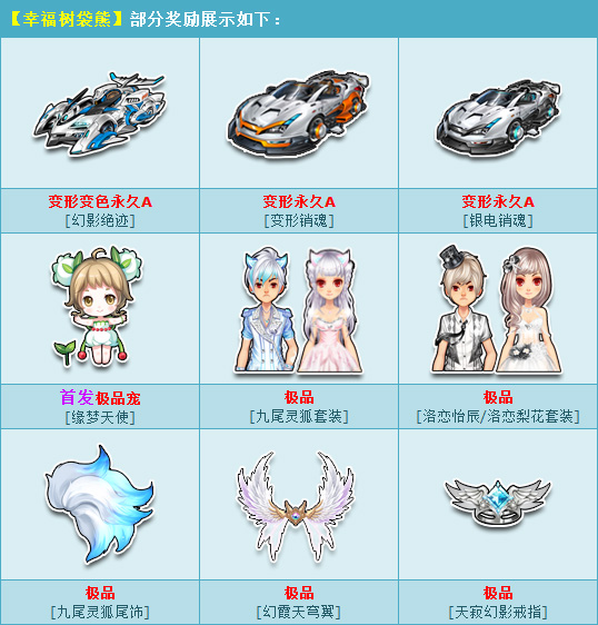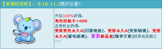 幸福树袋熊超萌来袭 变形变色永久A车等你拿!9月18日-11月2日期间,幸福树袋熊超萌来袭,购买后必得【角色经验卡+600】,还将有机会获赠变形变色永久A车【幻影绝迹】、变形永久A车【变形销魂/银电销魂】、首发极品宠物【缘梦天使】以及极品【九尾灵狐套装】、【九尾灵狐尾饰】或其他奖励之一!豪华大礼限时抢购中,不要错过哦!