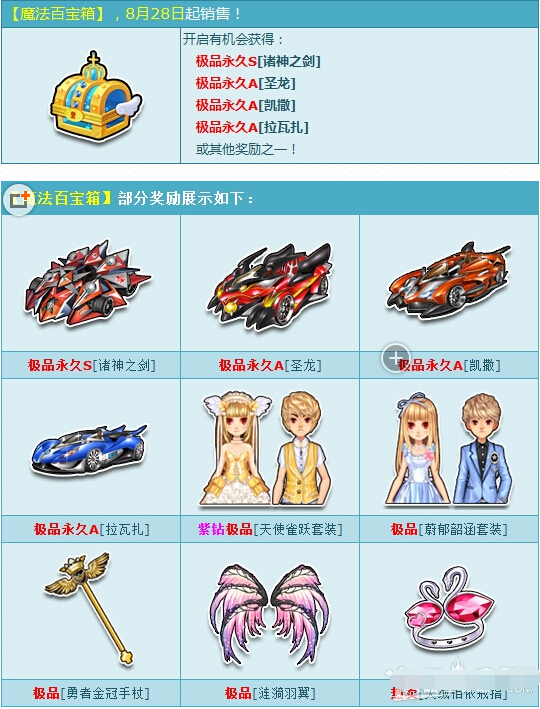 8月28日起,【魔法百宝箱】再次给力更新,打开百宝箱即有机会得极品永久S车【诸神之剑】、永久A车【圣龙/凯撒/拉瓦扎】、紫钻极品套装【天使雀跃套装】或其他奖励之一!