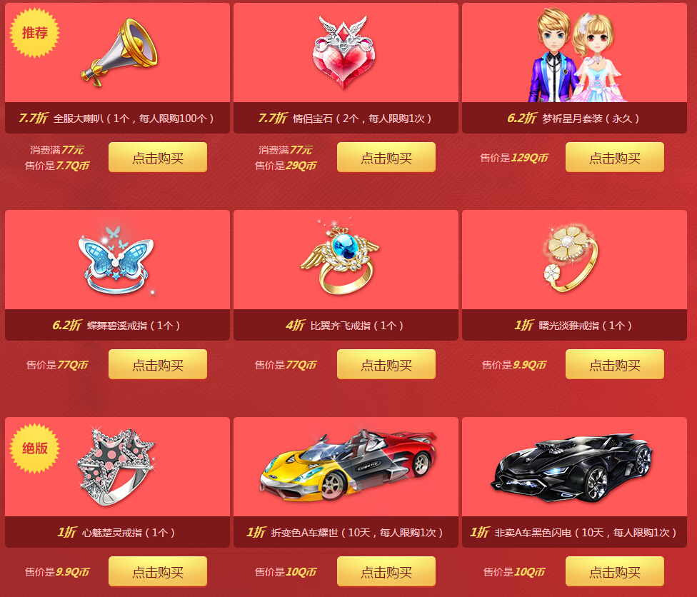 相关问题:QQ飞车七夕甜蜜来袭1折A车耀世9.5元是永久吗?