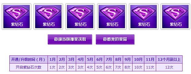 2.打开紫钻宝箱即得600点券!请玩家登录游戏查收点券。开奖次数按照以上方式对应,获得奖励到"我的紫钻石"中查看。