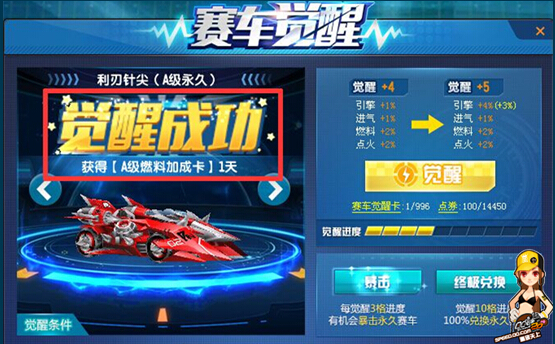 活动期间,玩家进入“商城-赛车强化-赛车觉醒”即可参与首次概率翻倍的赛车觉醒。每觉醒一次,消耗相对应的【觉醒兑换卡】及点券,觉醒成功至10格时,玩家可以点击“终极兑换”,通过消耗1张【觉醒兑换卡】,即可100%必得永久A车“利刃针尖”!