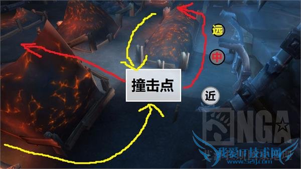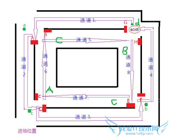 假设我作为一组队员,现在正身处于GH点,我要做的就是把视角摆成正面面对通道1,打通道1中的箱子。也就是打逆时针方向通道的箱子。所有只需要在图中撞击点右侧站撸即可。因为BOSS只会从黄色箭头的路径滚过来,对撞击点右侧的人员毫无影响。