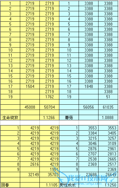 蘑菇因为持续30秒只能吃到20秒的BUFF,所以收益最低,为8.88%(蘑菇数据不带相生BUFF)。