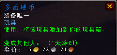2015年的万圣节新增加了一个玩具,多面硬币,可以变身成其他的种族,持续时间60分钟,CD为1天。