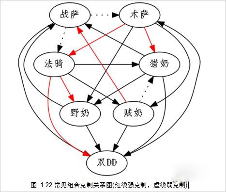 这是我绘制的一张22食物链图,基本阐明了主流组合之间的克制关系,战萨有个箭头指向术萨,意思就是战萨克制术萨,依次类推。这图比较主观,所以大家看看就行,