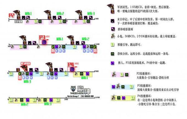 P2阶段的技能循环统一为紫底方便大家明白这些是固定的技能循环,总体跑位循环为:大致集合==>引导分边==>恐惧分担。在后面我会详细说明。