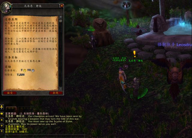 泰兰德已经同意将这把神器交给我们,不过这把神器与瓦洛恩•静枝对暮色森林的狼人的调查有关,因此由他保管,我们需前往暮色森林拿到这件神器。同时这件神器所蕴含强大的野兽之怒,需要具有强大实力的人才可以驾驭,从而避免被野兽之怒控制心智。穿过翡翠梦境之路,我们来到暮色森林传送点找到瓦洛恩。