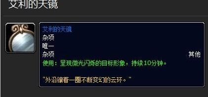 玩家还记得在熊猫人版本中的恐惧废土北面的女性熊猫人稀有艾丽吗?此妹子掉落的物品艾丽之天镜能够让玩家模仿任何物种的外形样貌,好玩之极呀!如果你下次再看到有人费劲力气变大自己和他的坐骑,你便可以用此镜cos一番,是不是简单便捷骚气十足。