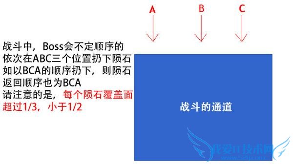 这个Boss最有威胁的一个技能(事实上也没有什么技能),就是会在左中右三个区域,以随机的区域,先后落下3个巨大的陨石,陨石滚过整个通道后会折返,再次滚回到Boss处,然后消失,进入下一轮循环。玩家对每个陨石,需要躲避两次。如落下顺序为左右中,则躲避顺序为右左左,右左左。
