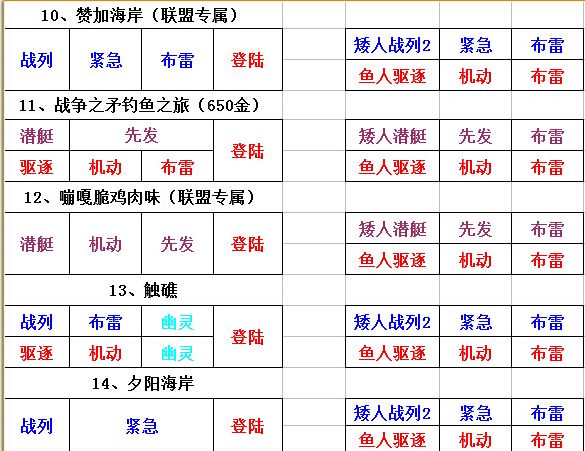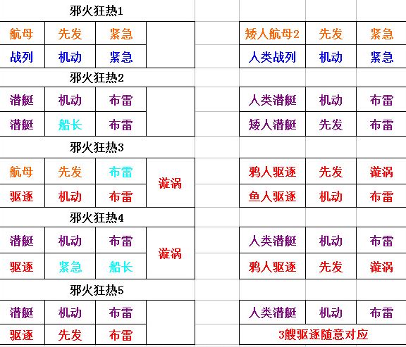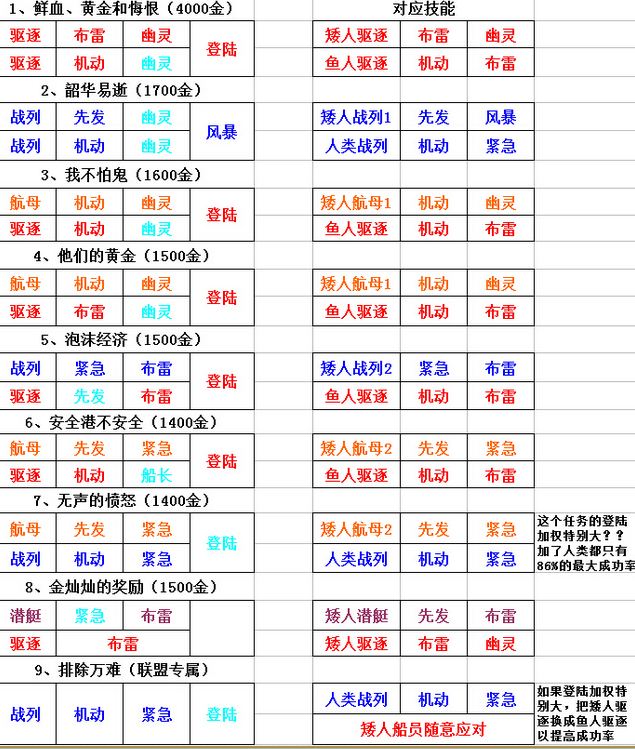 第一张图表示船坞金币任务的技能对应表,红色表示驱逐舰及技能,深蓝色表示战列舰及技能,橙色表示航母及技能,紫红色表示潜艇及技能,浅蓝色表示无法应对的技能。