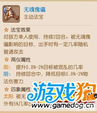 所以无魂傀儡这个法宝最好的两仪属性就是阳属性。同样四象属性必然是太阳属性。这样整体上会增加无魂傀儡10%以上混乱能力!