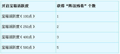 3)玩家开启“活跃度宝箱”时,可获得“阵法残卷”奖励: