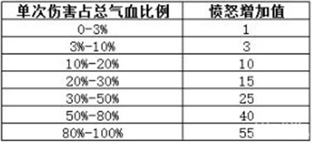 左边第一列代表你受到攻击时丢失的气血占你总气血的百分比,右边代表这次攻击会给你带来的愤怒的增加值。