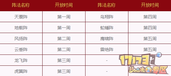 玩家可从"副本"进入选择相应的阵法进行挑战,每周维护后更换两种阵法,各周开放阵法分别为: