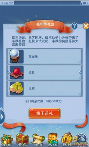 活动期间,玩家点击突发事件"童子送礼"图标即可进入玩法界面。在界面中点击"童子送礼"按钮即可开始领取礼物。每人每天有5次机会,每次消耗50点精力,每次获得10点幻境嘉年华积分。