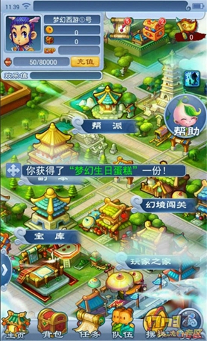 庆生大会每年12月18日是梦幻西游2的生日,为庆祝这一重要日子,在嘉年华活动期间,玩家每天参与口袋版活动即有机会为好友赠送生日蛋糕,赠送或者被赠送都可获得奖励。