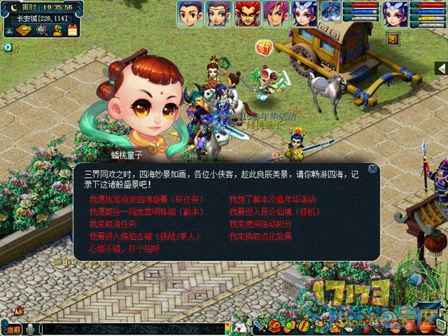 活动期间,玩家(角色等级≥30级,队伍人数≥3人)可在位于长安城(230,120)的蟠桃童子处领取任务。