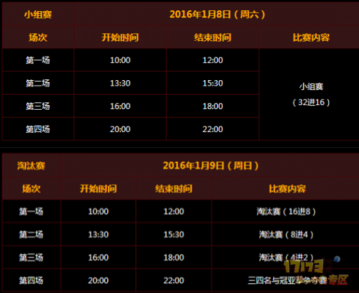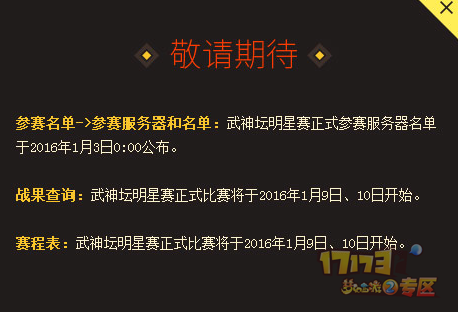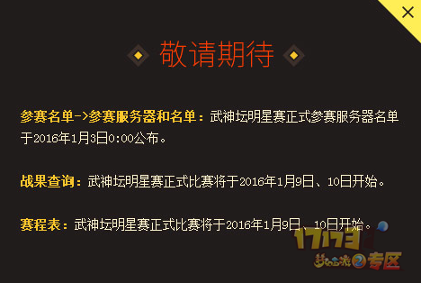 2016年1月9日为小组赛(32进16)。2016年1月10日为淘汰赛。比赛队伍需进入武神坛明星赛比赛服(早上8点开服)参加比赛。