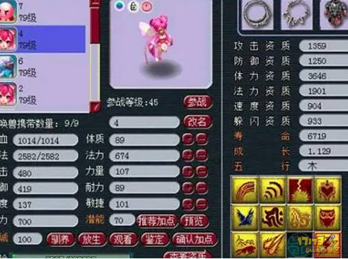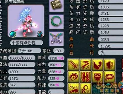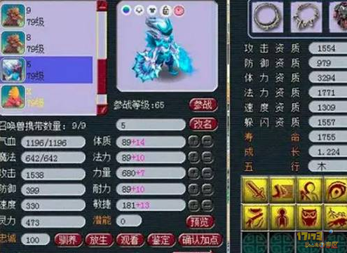 10技能壁垒、耐攻傀儡鬼,攻击资质1479,防御资质1385,成长1.291!这只宝宝的成长很高,技能也很不错,图中看不到它带的是什么套装,不过帅编觉得最适合它的就是高幸运套子了。