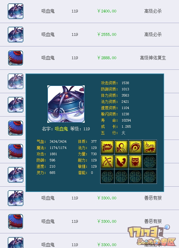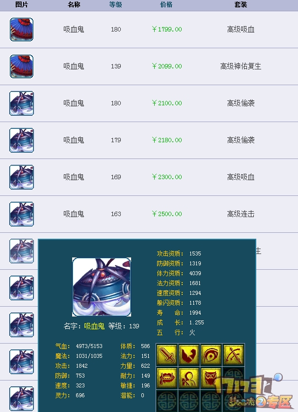 下面我放两张图,是全服搜索1500攻资以上,技能高连必吸偷夜强感神(带套装)的吸血鬼真宝宝,不同的是一张是119等级段的,一张是139-180等级段的