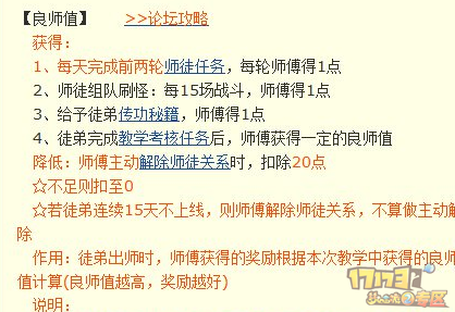 1、师傅只能收取一名本服徒弟与另一名外服徒弟,貌似是本周才改的吧,感觉封杀了刷师徒了,然后已经结拜为师徒的双方无法领取新道具“良师册”及“修学录”;原来已经获得的良师值是无法兑换物品奖励的,这我们知道,不过,进行一些传统的可获得良师值的操作,比如刷师徒任务,同样无法纳入“可兑换物品的良师值”中,也就是说,你想获得“可兑换物品的良师值”,需要重新收一名新徒弟....但现在只能收取一名徒弟,你想刷良师值?请解除原有的师徒关系,再重新收一名徒弟吧!获取条件比较苛刻,小编也是刚探索时发现的,不知算不算BUG。