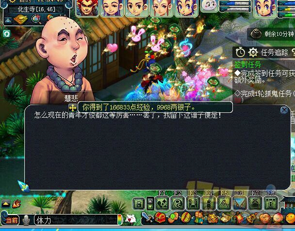 答:这是个刷经验的活动。环式任务我带了40轮队长抽奖十几个宝石,其他都是经验。活动额外获得奖励基本都是宝石,强化,金银锦盒。而且几率较低。副本任务一样。都是一些经验,物品奖励忽略不计。挑战难度过高。我这一组号杀不过去。怪有驱鬼。难度较大 >>详细