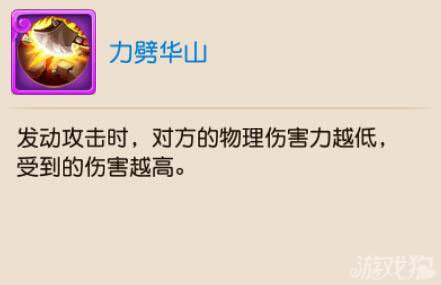 答:力劈华山效果: 发动攻击时,对方的物理伤害力越低,受到的伤害越高。附加物理攻击力=自身伤害-自身等级-目标伤害力 在对抗狮驼、大唐、攻宠的时候优势不是... >>详细