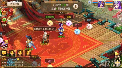 活动期间每天可两人组队找NPC"情缘使者"(长安城141,87)参与因缘际会玩法。场景中NPC红线老人会提出一些问题,每个泡泡会针对此问题提出一种观点。若你赞同泡泡代表的观点,则找到该泡泡,将红线系在它身上。两人都将红线系在泡泡上后,红线老人会根据你们的选择是否一致看你们是否有缘。答完10道题后即可完成活动。