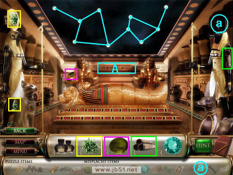 在金字塔里找齐物品2、3,在A处是个机关,连接天花板上的星星,但是暂时还没有解决的方法,等后面回来完成它,图中的天花板是正确的连接方式,但是在没得到方法之前不知道能不能先连接好,大家可以试试,嘿嘿。这个时候只有物品1和4各差一个部分,先去场景四。(道具a金盘子在场景四获得。天花板星星机关的排列方法需要在场景二得到的墨水,给场景一书库的白衣男子才能得到。)图6.32
