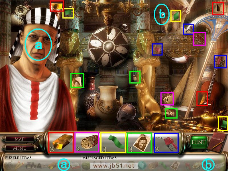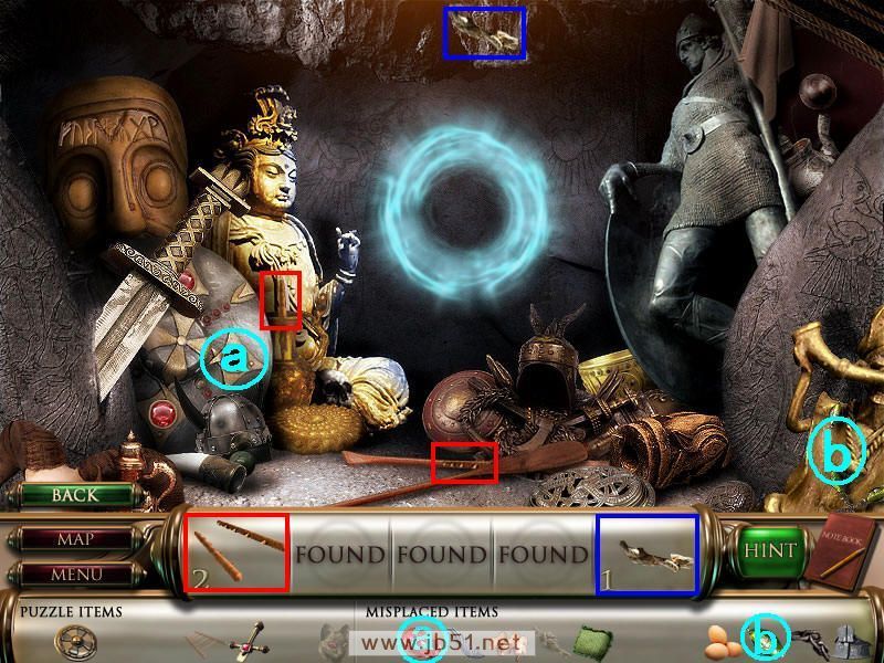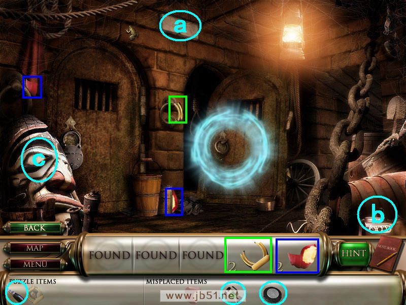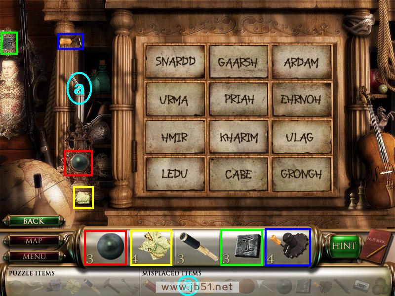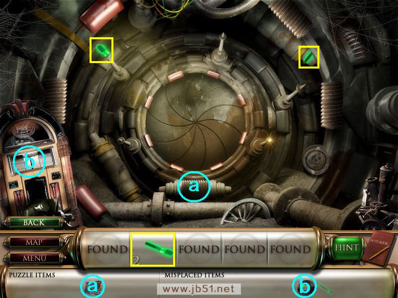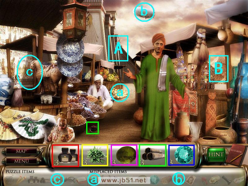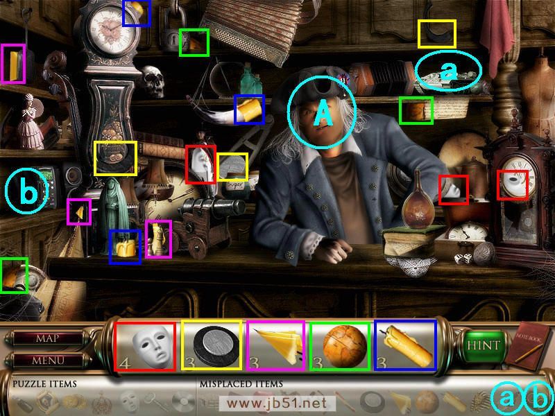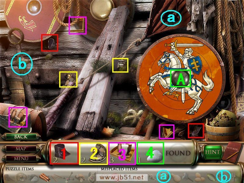 然后在下面这个场景中找齐1、2、3、4物品,其中物品4是需要完成中间的拼图后,在拼图中间的A处得到的。找齐物品后,点左下角的MAP按钮去下一个场景。(a是绿色的布,在场景二找到,b铁链在场景四找到。)图1.2