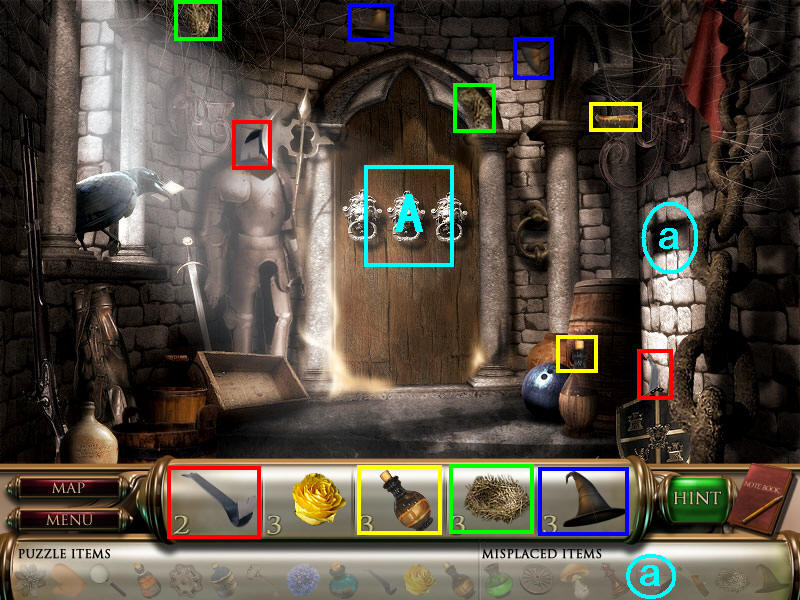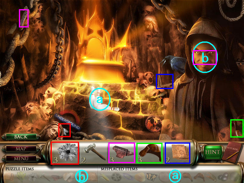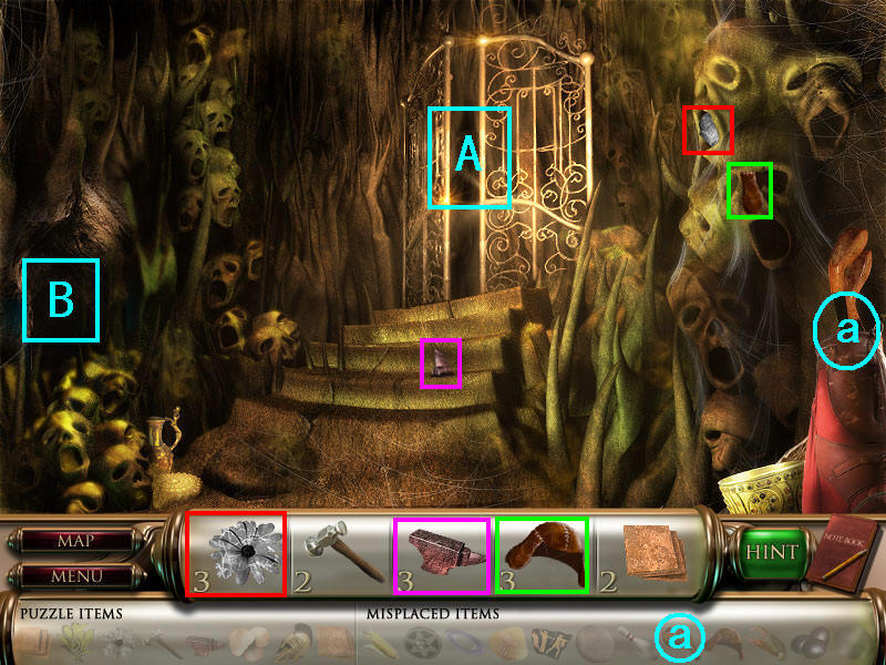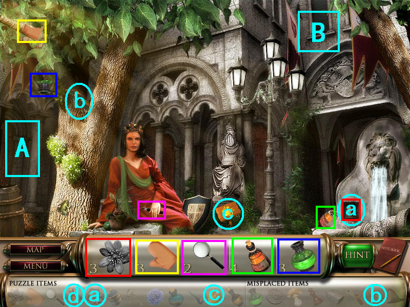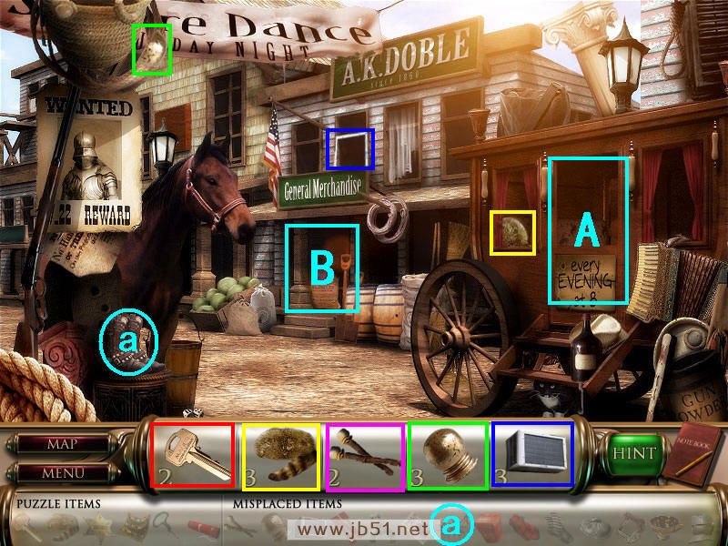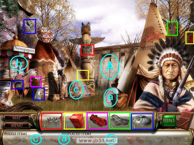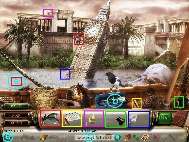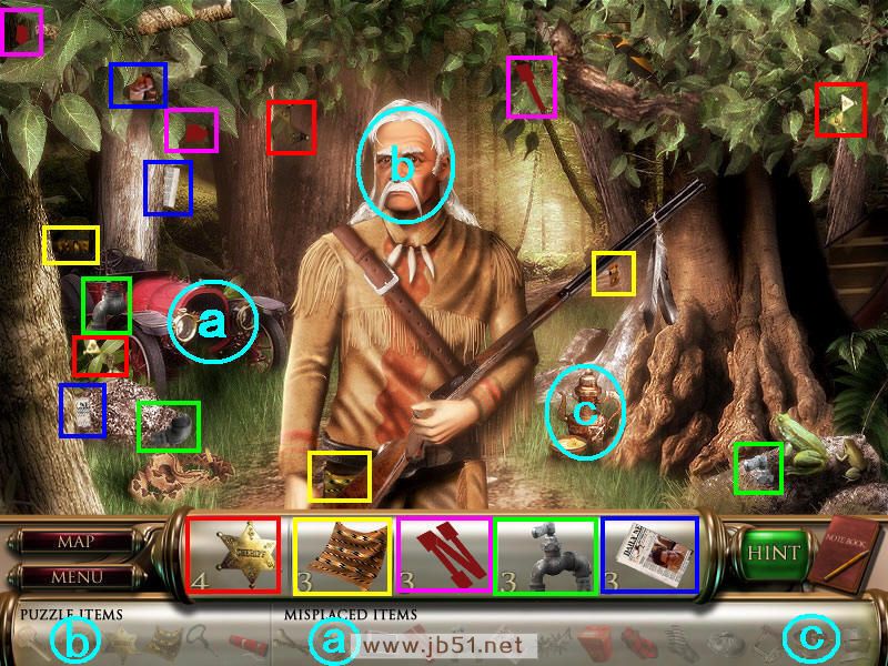 然后在下面这个场景中找齐1、2、3、4物品,其中物品4是需要完成中间的拼图后,在拼图中间的A处得到的。找齐物品后,点左下角的MAP按钮去下一个场景。(a是绿色的布,在场景二找到,b铁链在场景四找到。)图1.2